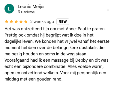 Na afloop van de massage drink je wat. Wanneer je er klaar voor bent, komt Anne-Paul naar de praktijk en gaat hij met jou in gesprek over je ontwikkelvraag.